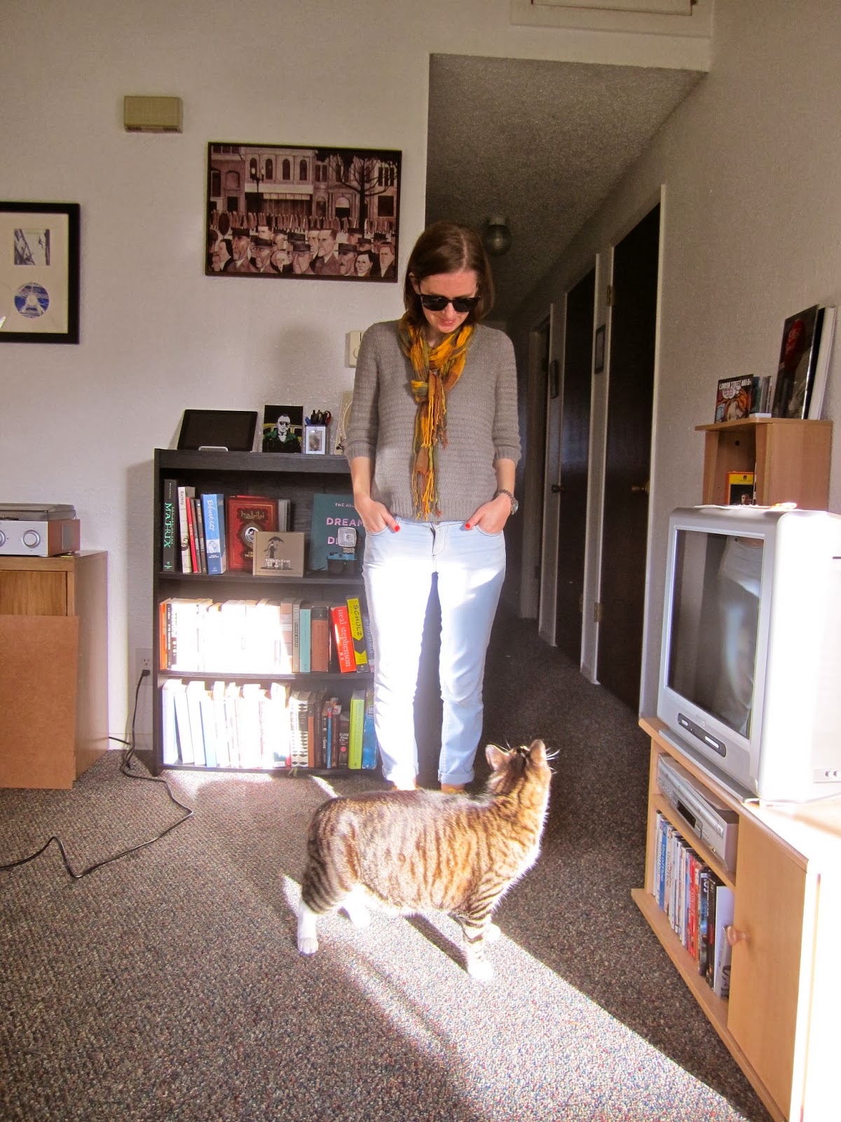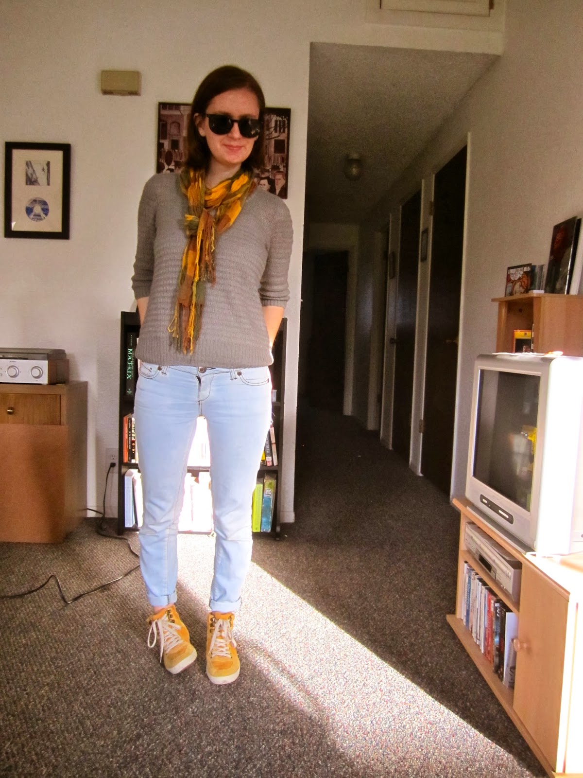 | Gap sweater from Labels consignment, Buffalo Exchange jeans bleached by me, Goodwill scarf, H&M shoes |
